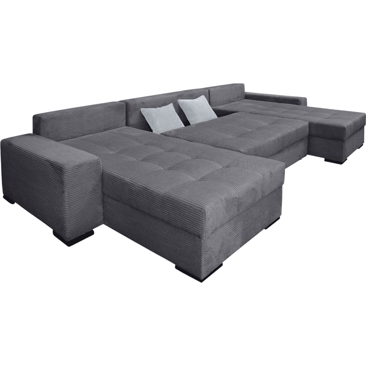 Denna U-soffa från COLLECTION AB förvandlas snabbt till en bekväm gästsäng eller XXL-sittyta. Den praktiska sengeboksen ger gömt utrymme för kuddar, filtar eller andra tillbehör. Fjäderkärnstoppningen ger behaglig komfort både för sittande och liggande. Fyra lika stora ryggkuddar ger extra komfort och stödjer en avslappnad sittställning. Tack vare den klädda baksidan kan soffan placeras fritt i rummet – perfekt för olika rumskoncepter. De svarta plastfötterna är stabila och extremt robusta.