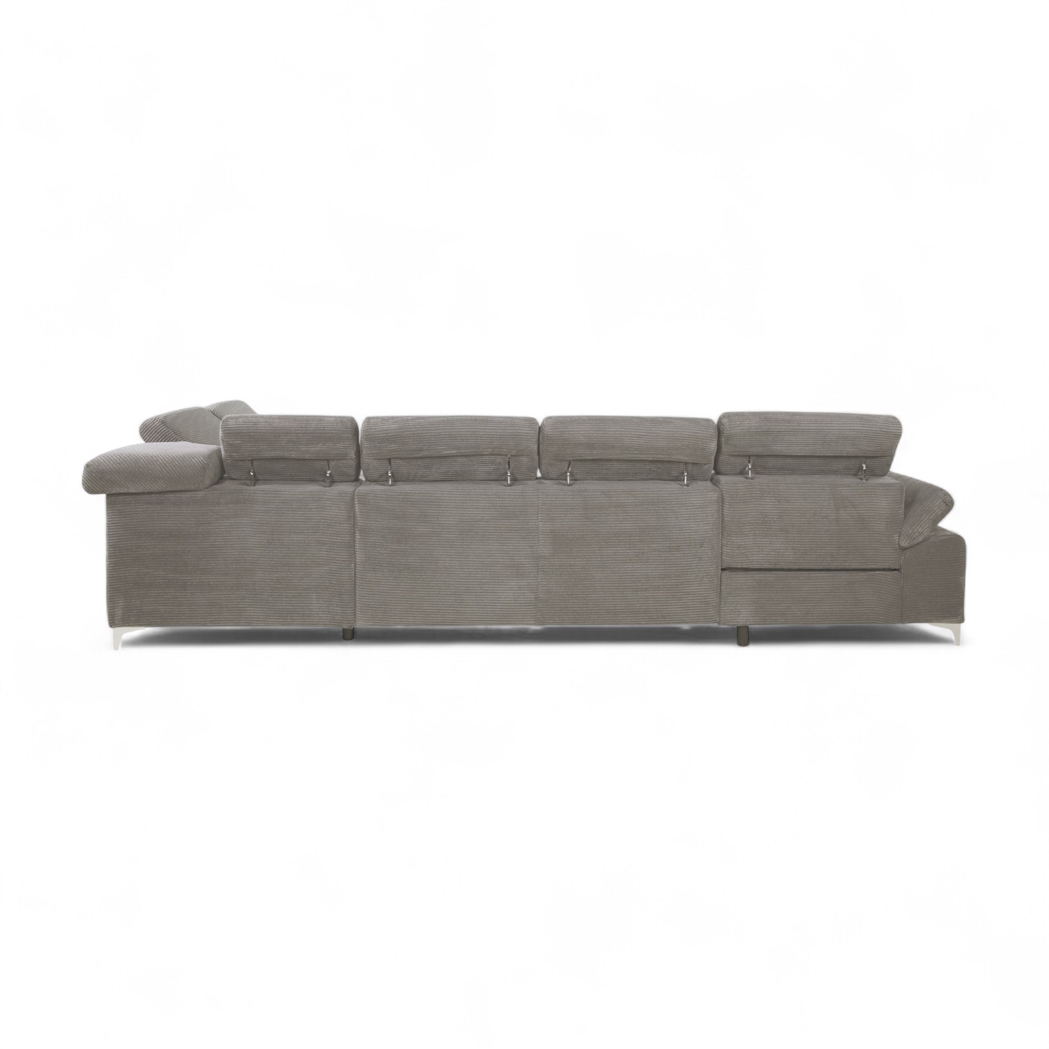Saturn 4-sits U-bäddsoffa med vänster schäslong och höger divan kombinerar komfort och smart funktionalitet. Med några enkla handgrepp förvandlas soffan till en bekväm dubbelsäng, perfekt för gästrum eller mindre utrymmen. Under sitsen finns rymliga förvaringslådor där du får plats med både täcke och kuddar. Justerbara nackstöd och armstöd låter dig anpassa komforten efter dina behov, medan vågfjäderbasen ger bra stöd både för sittande och liggande. Det mjuka manchestertygtet Poso 100 i beige färg är slitstark och behagligt att röra vid.